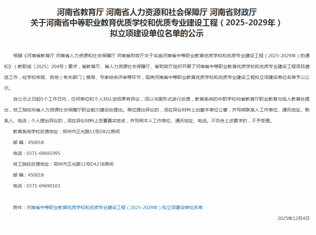 近日,河南省教育厅、河南省人力资源和社会保障厅、河南省财政厅联合发布《关于河南省中等职业教育优质学校和优质专业建设工程(2025-2029年)拟立项建设单位名单的公示》。经过学校申报、市级推荐、专家综合评审等多轮严格遴选,濮阳技师学院成功入选“河南省中等职业教育优质学校”拟立项建设单位,标志着学院办学实力与育人成效迈向高质量发展新阶段。