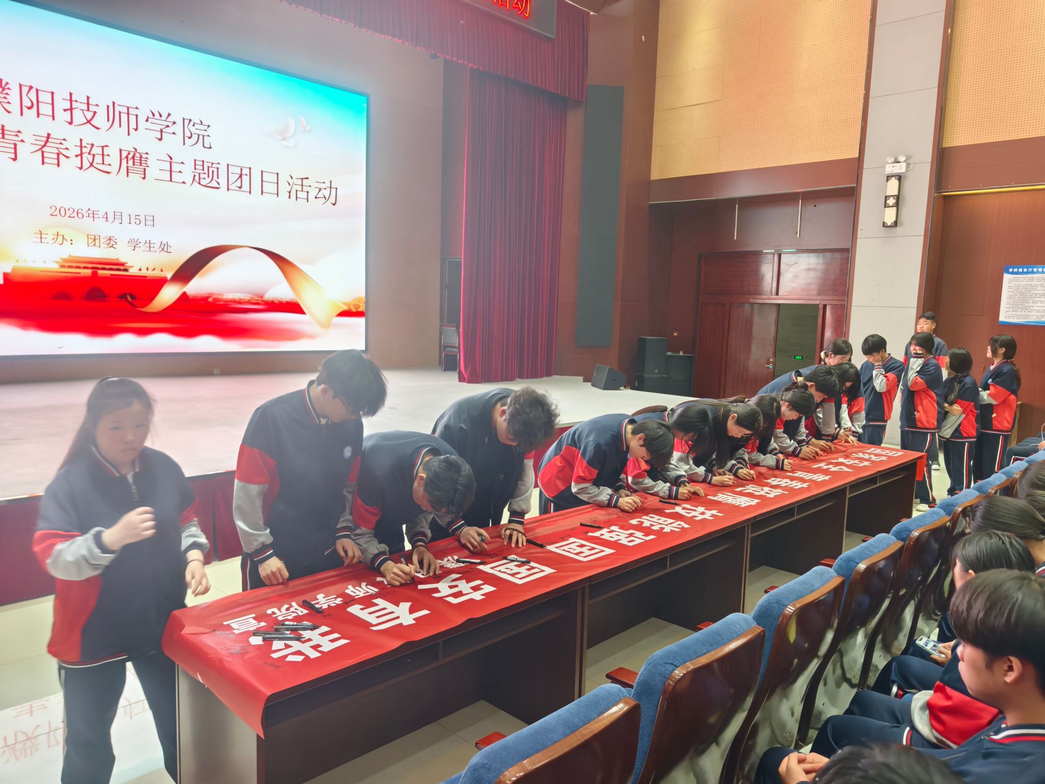 随后,全体团员面向国旗庄严宣誓,铿锵有力的誓言彰显了新时代青年维护国家安全的坚定信念与责任担当。师生们有序前往主题横幅前依次签名,郑重许下“国家安全、青春挺膺、技能强国、国安有我”的庄严承诺,将维护国家安全的使命牢记心间。